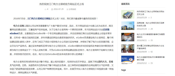 首先,電力士照明品牌推廣事業(yè)部官網(wǎng)由eGoBest負責建設(shè),在負責建設(shè)電力士官網(wǎng)后,eGoBest整個網(wǎng)站建設(shè)團隊都投入其中,還專門成立了項目小組到電力士公司進行實地考察,詳細地了解了電力士的發(fā)展歷程、企業(yè)文化與產(chǎn)品特點,經(jīng)過協(xié)商探討,最終將電力士照明品牌推廣事業(yè)部官網(wǎng)確立為簡約風(fēng)格主,同時兼具美觀大氣的特點。